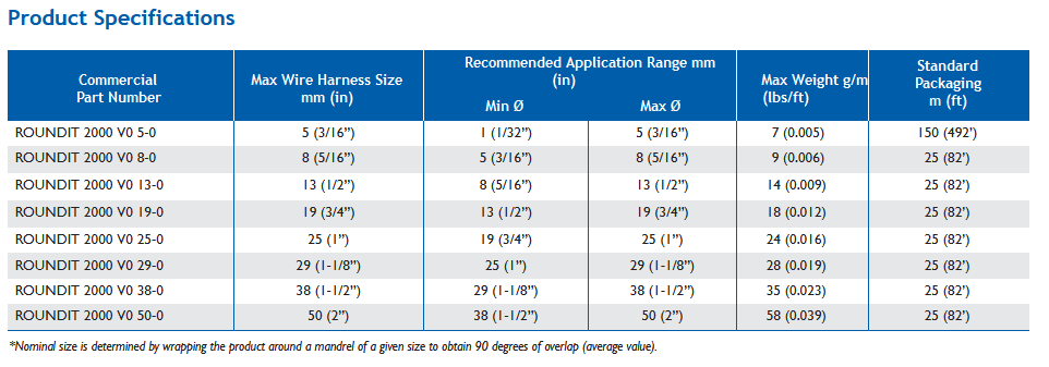 The self-wrapping feature of Roundit® 2000 V0 allows for quick and easy installation and removal of the product for assembly and maintenance. Roundit® 2000 V0 may be installed or removed without any manipulation of connectors or fittings and is an ideal solution where breakouts are necessary. Its wrappable construction allows stocking of a limited range of sizes to cover a wide range of diameters.